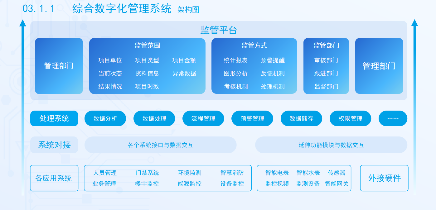 用數字化信息技術,嵌接各集成系統平臺;將各類數據信息進行匯總處理,與統一監控管理,形成頂層統一統籌管控及數據分析。